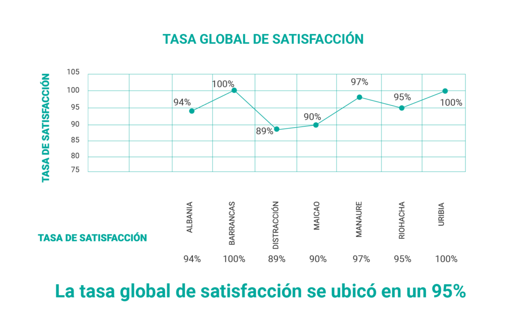 3295 afiliados participaron en la consulta a través de la aplicación de encuesta de satisfacción por los servicios que reciben de la EPSI ANAS WAYUU y su red prestadora de servicios de salud, durante los meses de abril, Mayo, Junio, manteniéndonos con una tasa global de satisfacción del 96%, esta calificación que nos dieron por municipio: